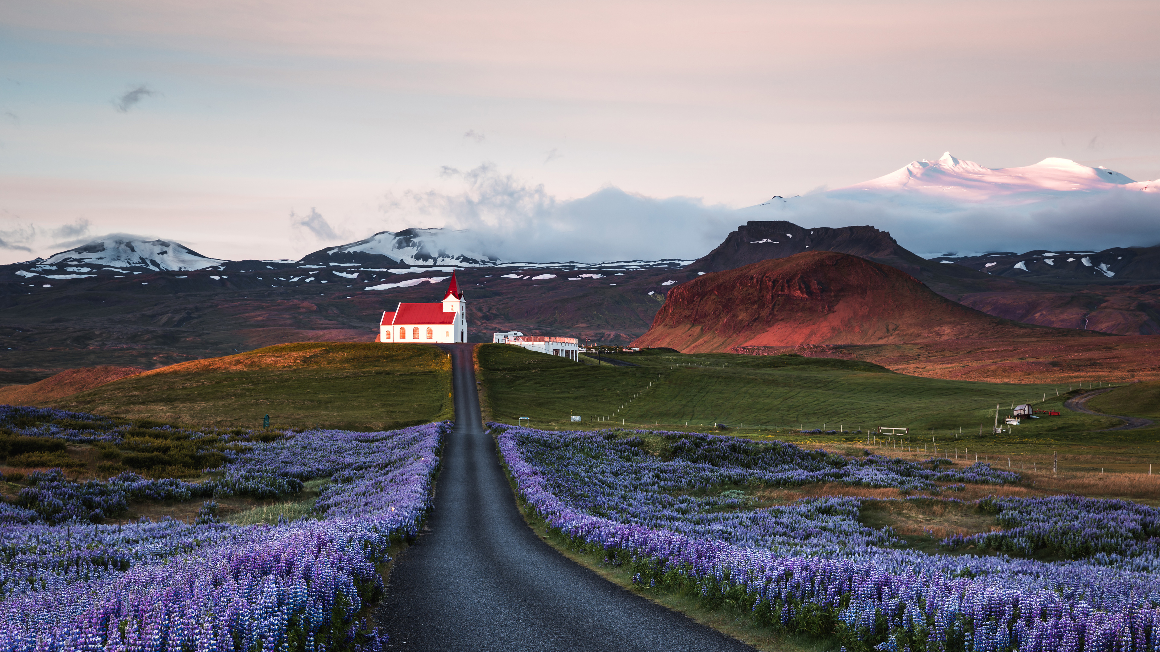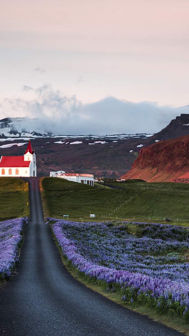 Florescendo para a vida Campos de tremoços e igreja ao nascer do sol, Península de Snæfellsnes, Islândia (© Matteo Colombo/Getty Images)