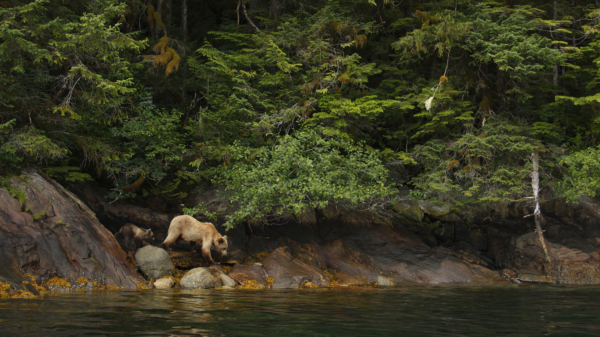 Grizzly bear and cub Adult female grizzly bear and cub in the Great Bear Rainforest, B.C. (© Jack Chapman/Minden Pictures)