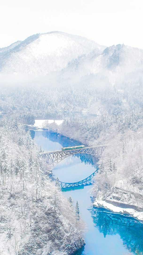 The Tadami Line is one of the most scenic railway lines in Japan. It winds through beautiful landscapes from Aizu-Wakamatsu, Fukushima Prefecture to Uonuma, Niigata Prefecture. The Daiichi Tadami River Bridge, pictured in today"s image, is a well-known landmark along this stretch. As the train glides across the bridge, travellers are treated to gorgeous vistas of the river below and the lush forests that blanket the area. After a snowfall, the icy blue water of the Tadami River cuts a bold streak through the forest, providing a welcome splash of colour in a blanket of white.