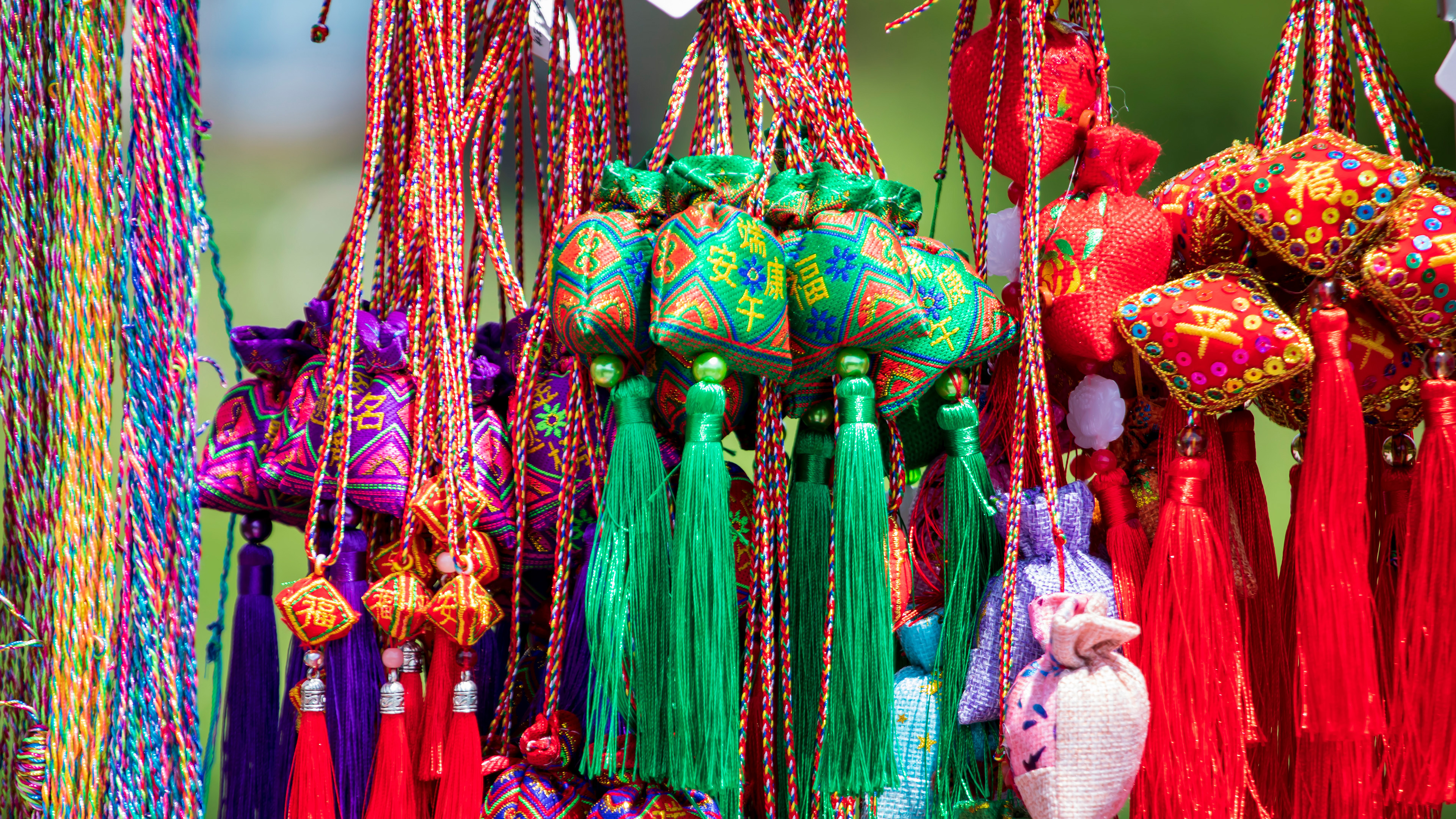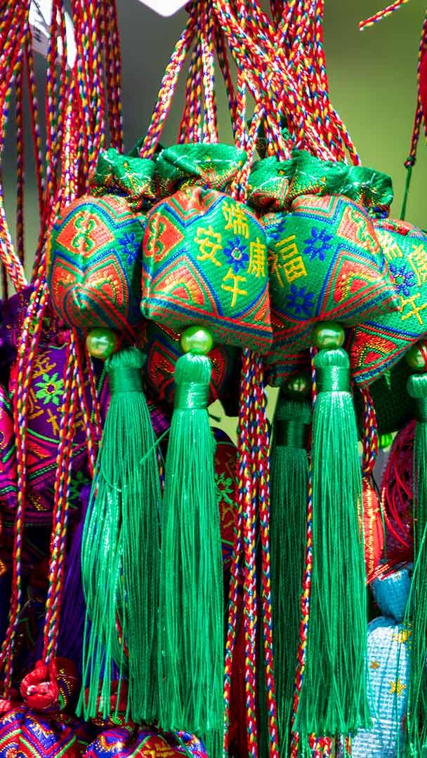 充满节日氛围节装饰 用彩色丝线串成的香囊,端午节前夕的庙会上,吉林省吉林市,中国 (© Visual China Group/Getty Images)