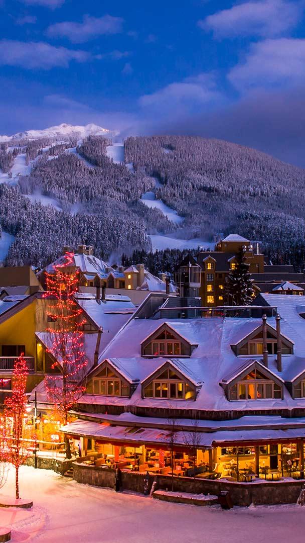 灯光点亮了悠闲的小镇 黑梳山附近的惠斯勒小镇,加拿大不列颠哥伦比亚省 (© VisualCommunications/Getty Images)