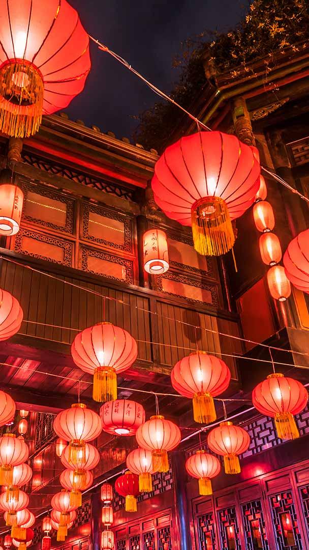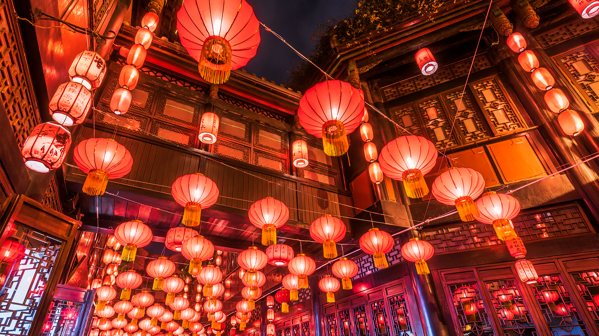 点亮一盏明灯,愿您万事顺意! 锦里街上悬挂的红色中国灯笼,成都,中国四川省 (© Philippe LEJEANVRE/Getty images)