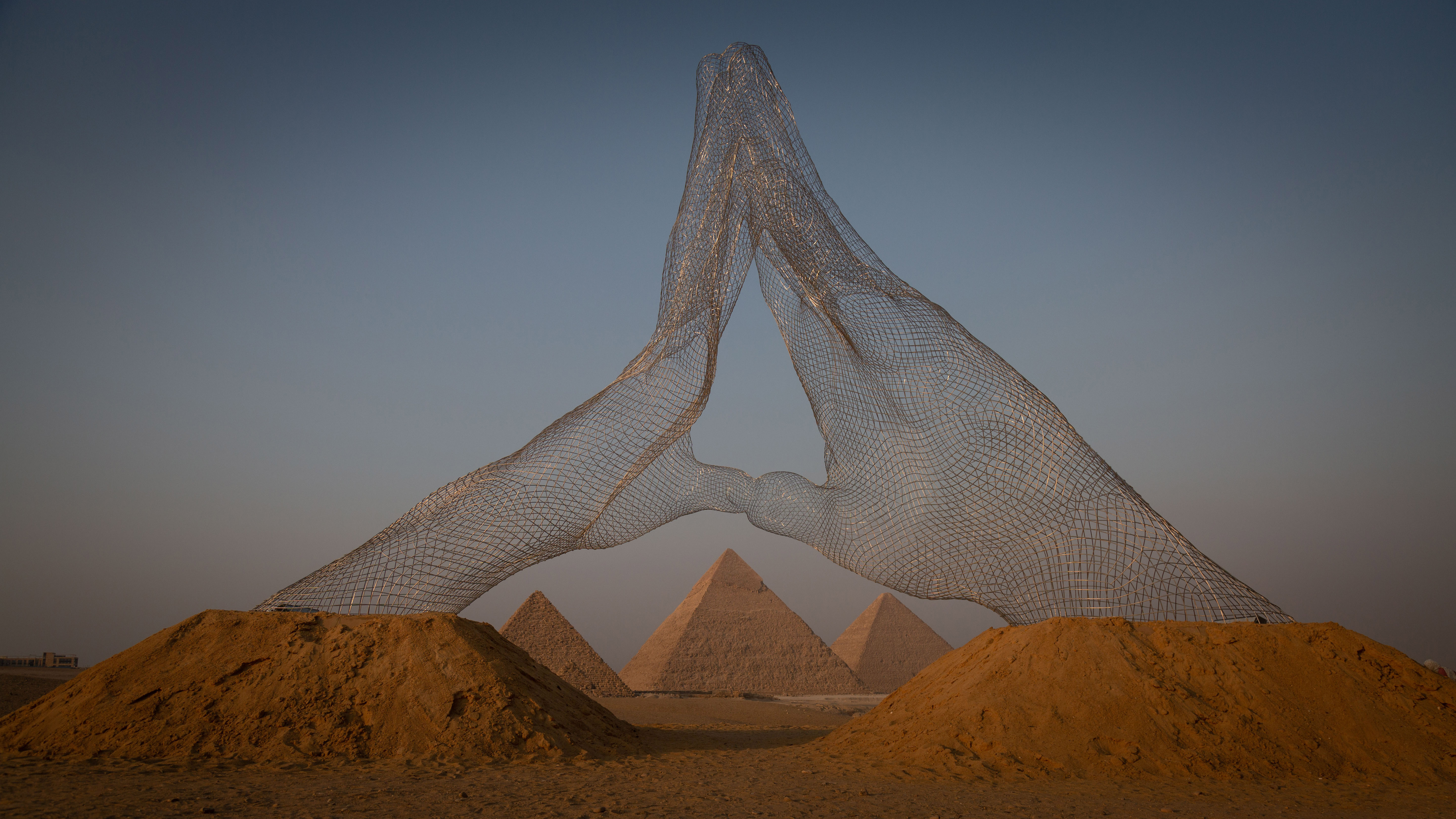 Antike und Moderne, eine Hand wäscht die andere „Together” von Lorenzo Quinn, Große Pyramiden von Gizeh, Kairo, Ägypten (© Sima Diab/Getty Images)