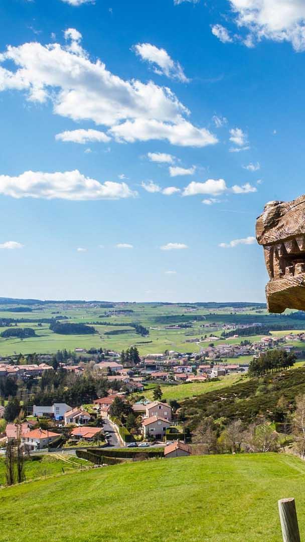 La bête veille sur la vallée Saugues et de sa sculpture en bois de la bête du Gevaudan, Haute-Loire (© Gautier Stephane/Alamy Stock Photo)