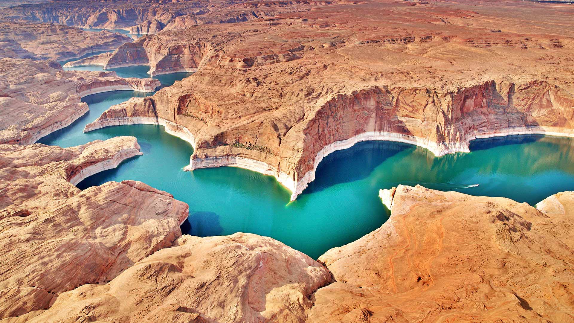 Man-made, meandering Lake Powell Lake Powell on the Colorado River, USA (© Peter Schaefer/Alamy)