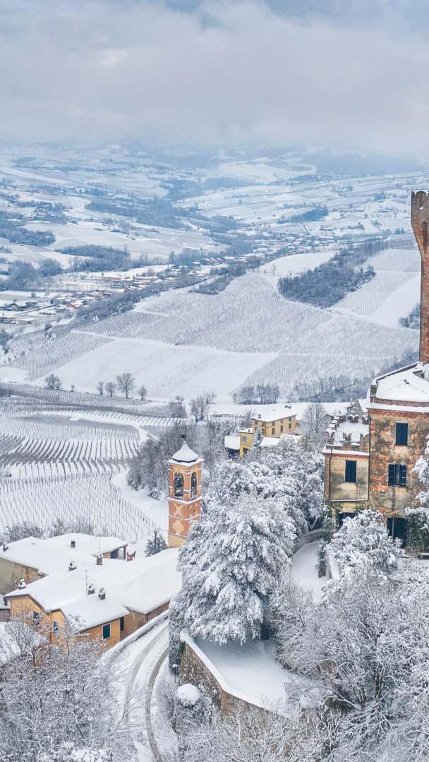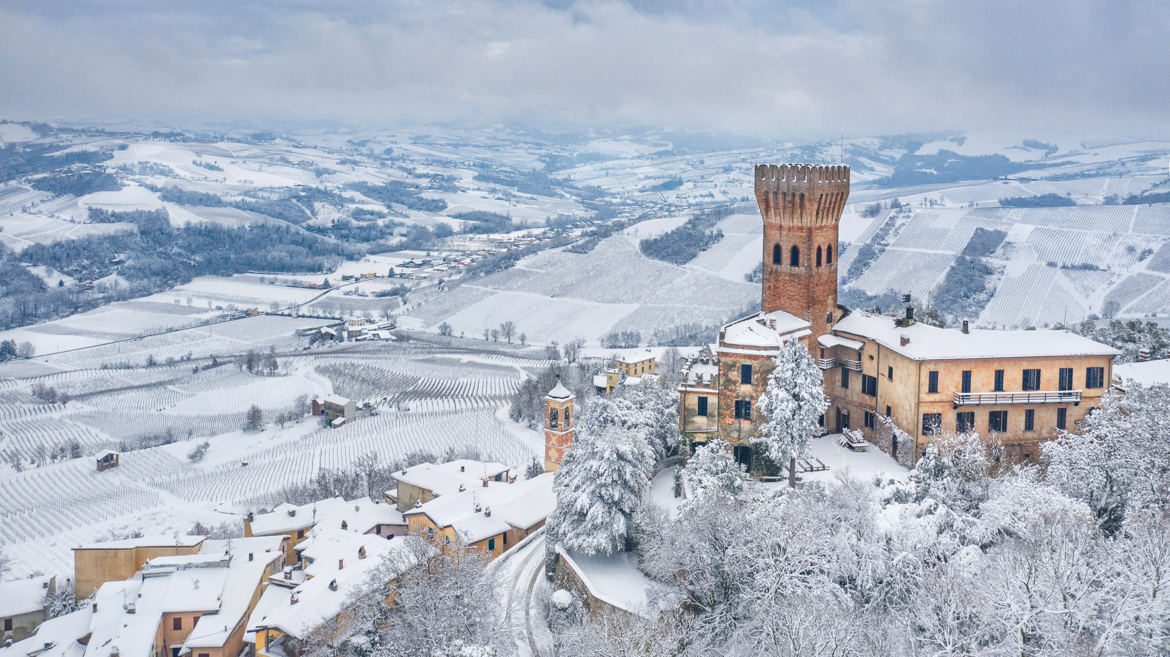 Un castello sulle bianche colline Il castello di Cigognola immerso nella neve, Pavia (© Massimo Ripani/Sime/eStock Photo)