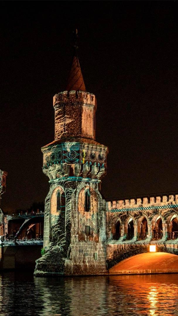 Un vecchio ponte sotto una nuova luce Proiezioni di luci sul ponte Oberbaum durante lannuale Festival delle Luci a Berlino, Germania (© John MacDougall/AFP via Getty Images)