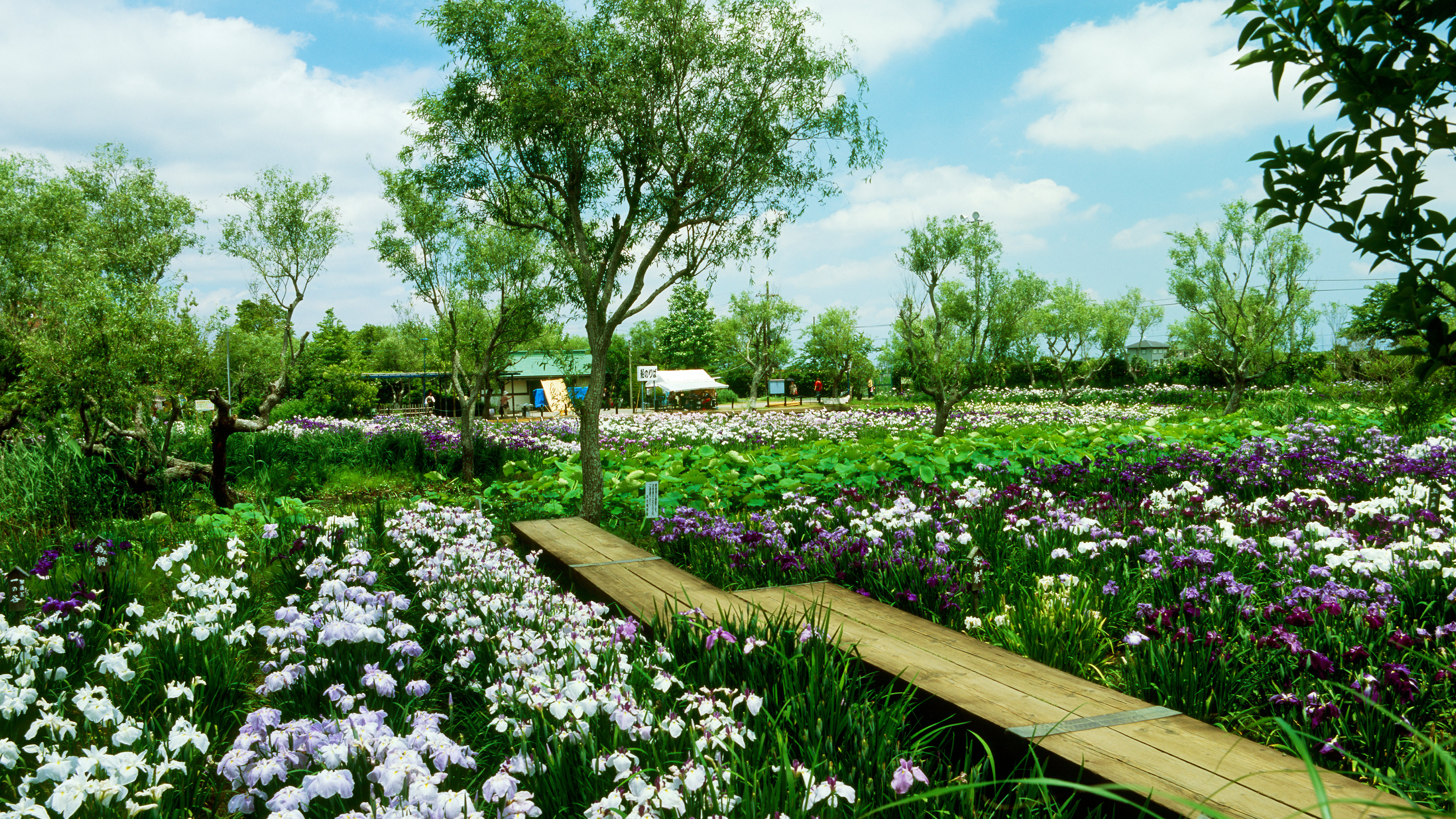 水郷筑波国定公園内に位置する水郷佐原あやめパークは、島や橋、水路が配され、江戸時代から続く水郷の風情を今に伝えています。6 月上旬には 400 品種 150 万本のハナショウブ、7 ~ 8 月には約 300 品種のハスが咲き誇り、園内水路を巡るサッパ舟という小舟に乗って、その様子を間近で楽しむことができます…