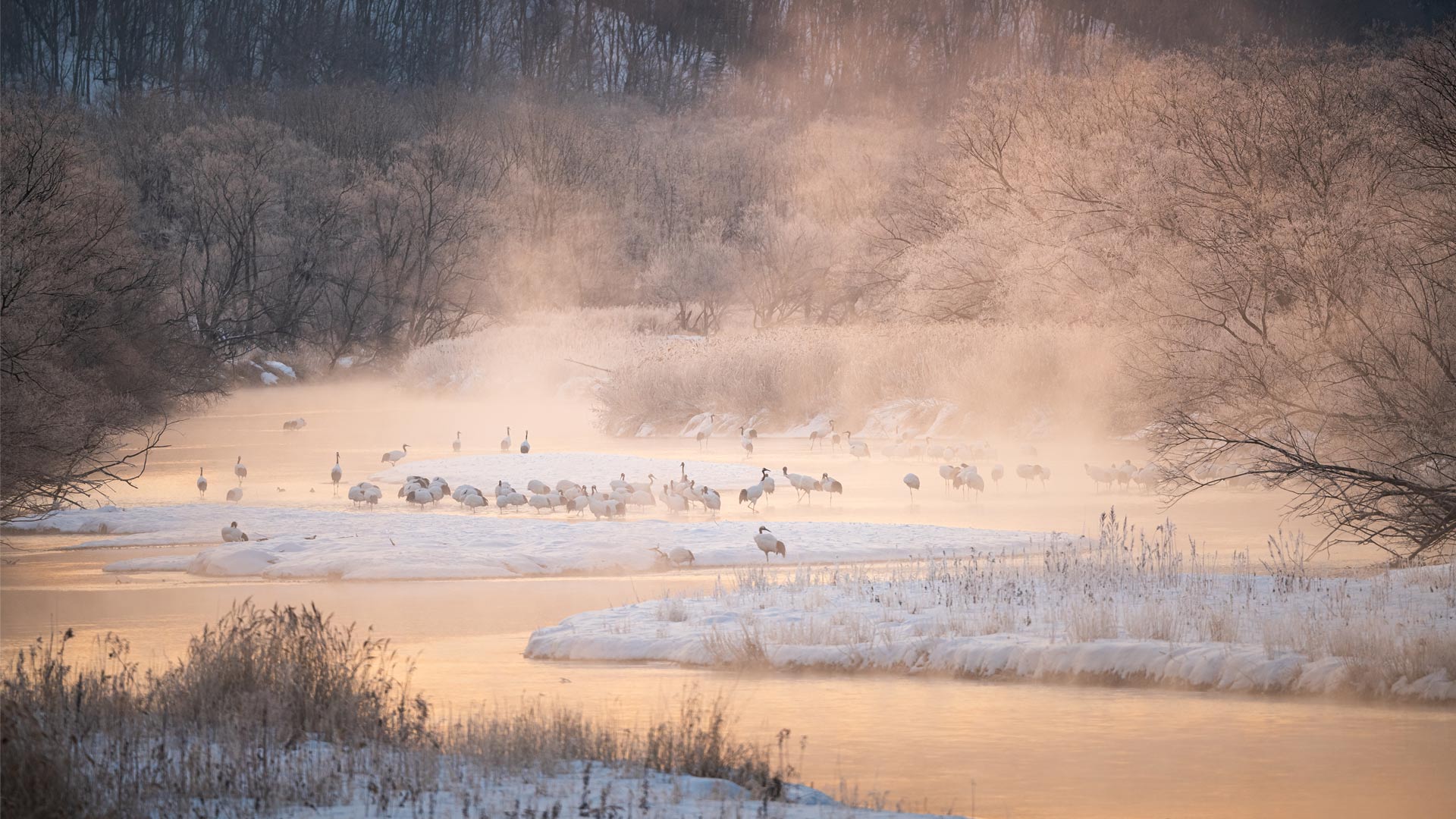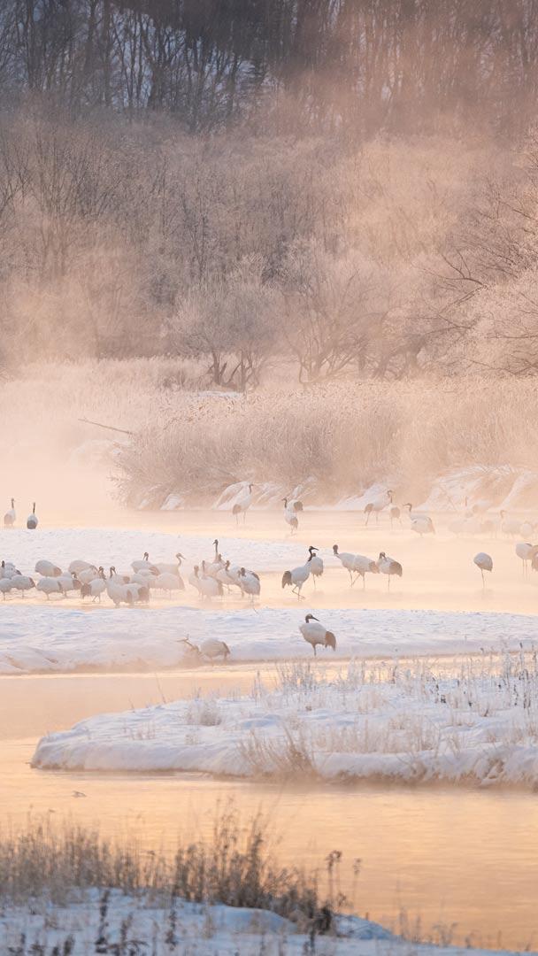 今日 1 月 20 日は大寒。太陽が黄経 300 度の位置にあるときを指し、一年の中で最も寒い時期です。ここ北海道鶴居村の音羽橋付近で、早朝の川霧が立ち込める中、たくさんのタンチョウが佇んでいます…