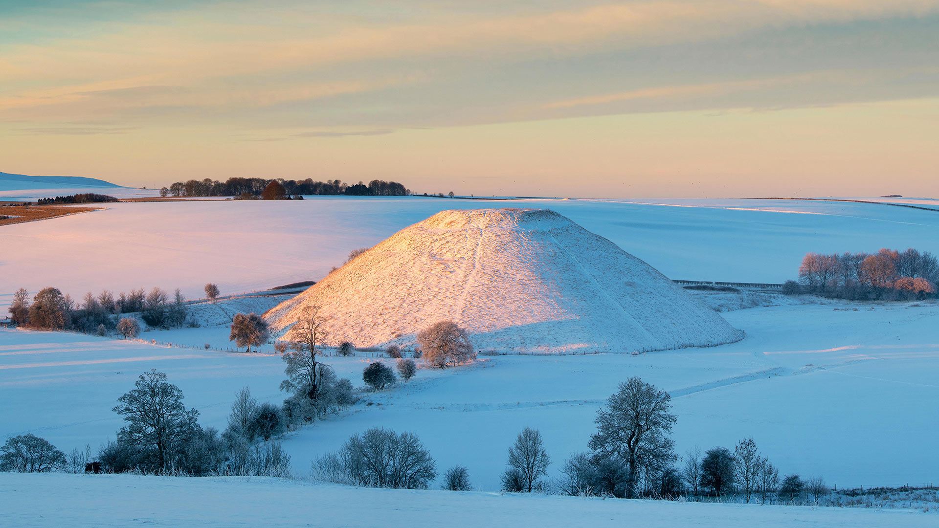 The glowing winter Silbury Hill in the winter snow at sunrise, Avebury, Wiltshire (© Tim Gainey/Alamy)