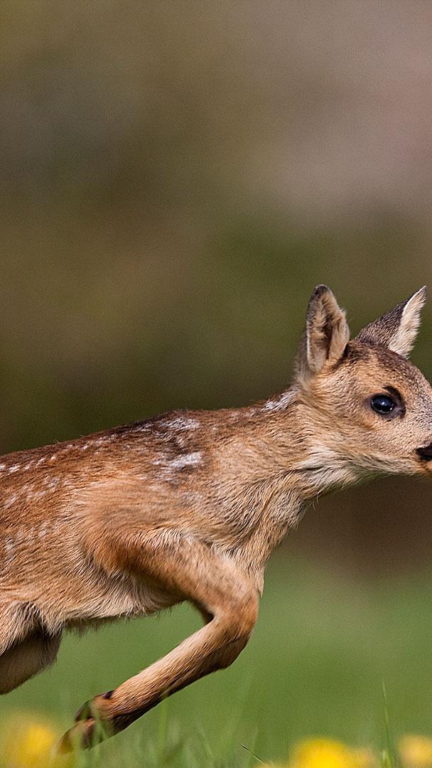 Here we go! Roe deer fawn running on grass in Normandy, France (© Gerard Lacz/Minden)