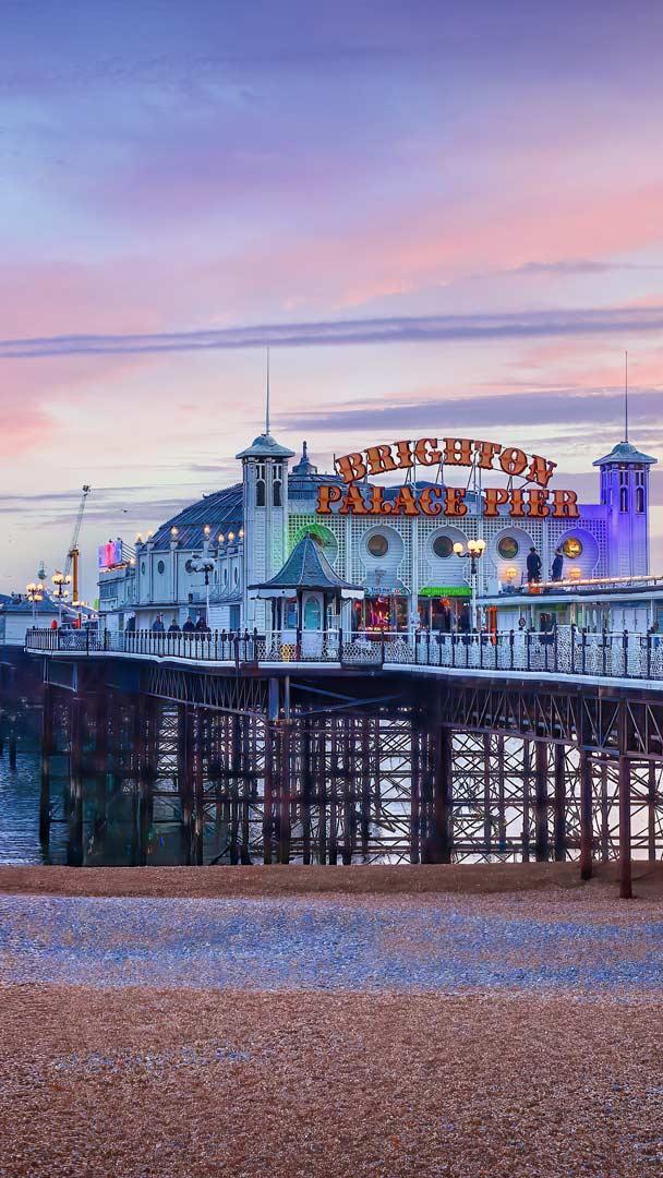 Rides above the tide Brighton Pier at sunset, England, UK (© Peppy Graphics/Shutterstock)