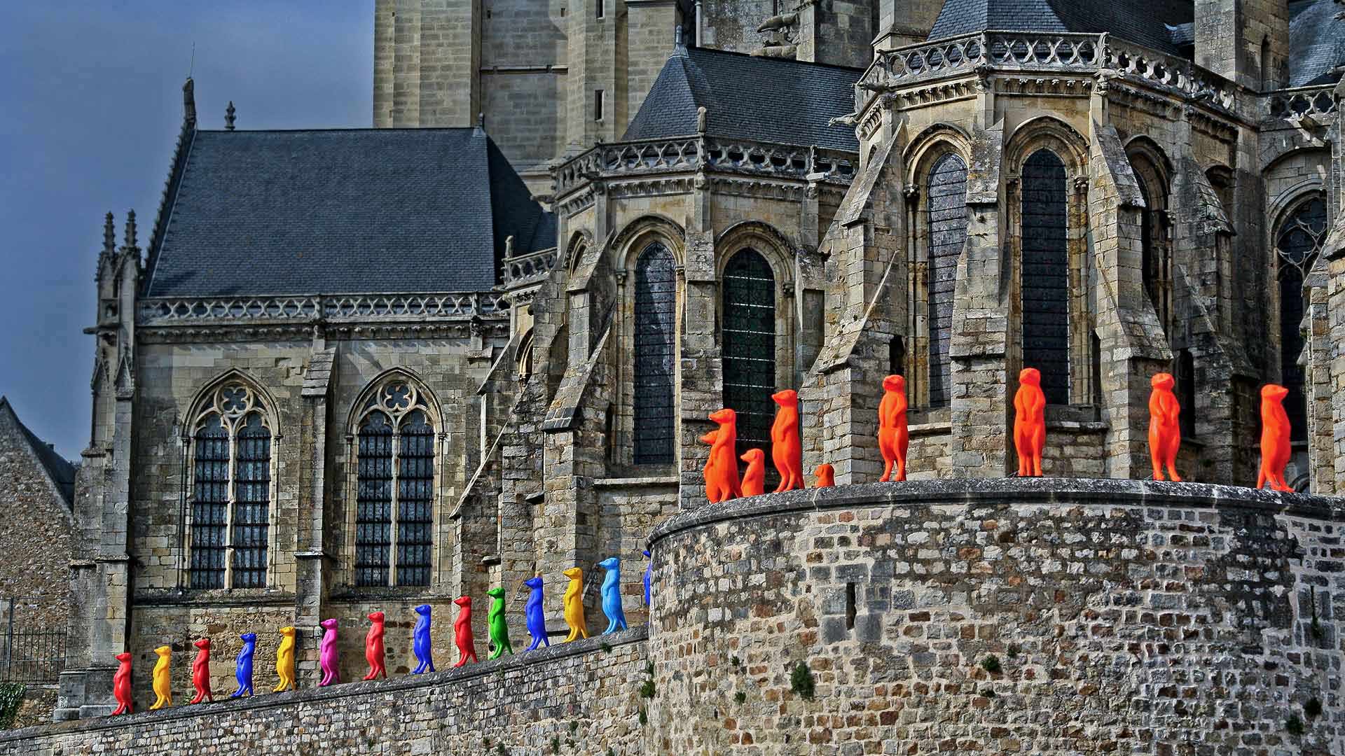 If you ever encounter a giant plastic snail in the city or an army of rainbow-colored meerkats holding sentry outside a historic building, it’s likely an art installation from the Cracking Art collective. The group uses recyclable plastic to craft vivid representations of meerkats, elephants, snails, and other natural creatures for traveling art installations in unexpected locations. The collective’s use of plastic is meant to call attention to the sometimes blurry connection between natural and artificial reality, inviting viewers to reexamine the world around them. The meerkat exhibit on our homepage took place in 2015 at Le Mans Cathedral in Le Mans, France.