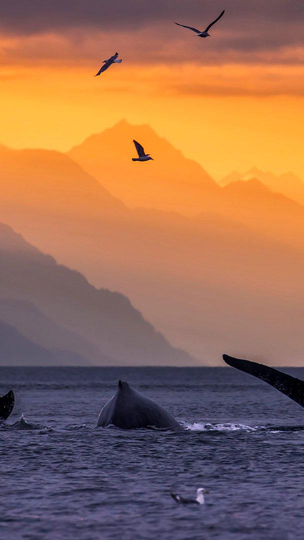 Humpback whales are found in virtually all the world’s oceans, though they don’t swim in the extra-cold waters of the Arctic. This pod is breaching the surface of Lynn Canal in the Alaska portion of the Inside Passage, where the whales return in summer for the feeding season after sensibly wintering in warmer tropical waters.